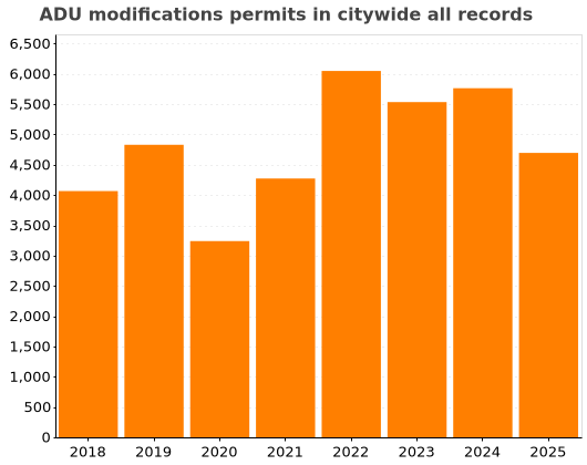 Last year, the city of Los Angeles permitted 6,626 of them, the second-highest count on record, according to a Crosstown analysis of data from the Department of Building and Safety. The proliferation of ADUs stands in contrast to an otherwise anemic housing construction market. In 2024, the city permitted only 7,038 new apartment units, the lowest level in over a decade.